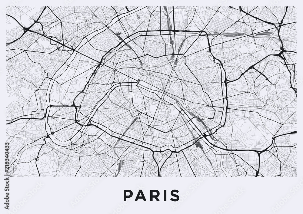 Light Paris city map. Road map of Paris (France). Black and white